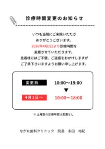 2026.03.23 診療時間変更のお知らせ いつも当院にご来院いただきありがとうございます。 2026年4月1日より診療時間を変更させていただきます。 患者様にはご不便、ご迷惑をおかけしますがご了承下さいますようお願い申し上げます。 変更前 10:00〜19:00 変更後 10:00〜18:00 *土曜日の診療時間は変更なし